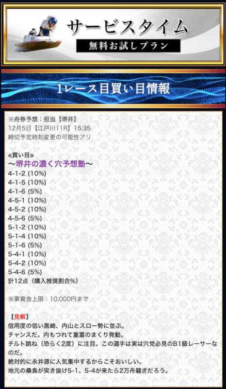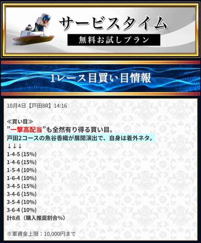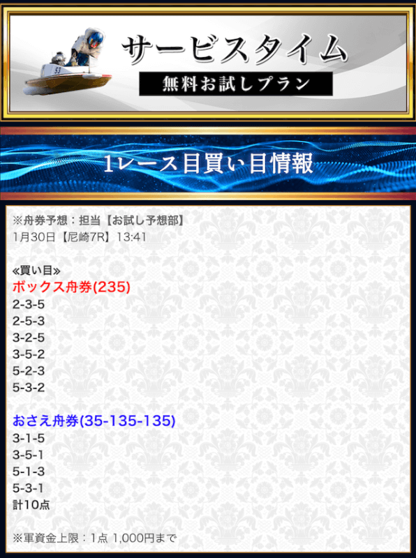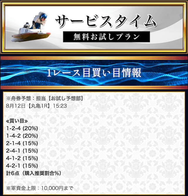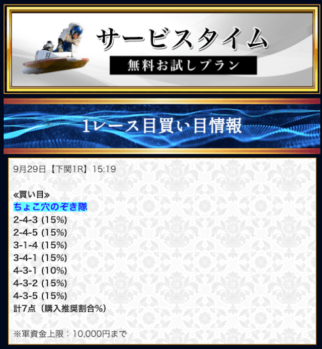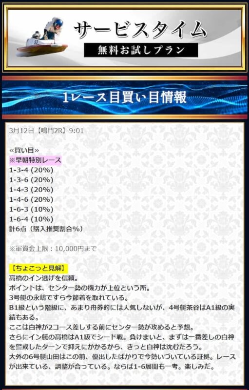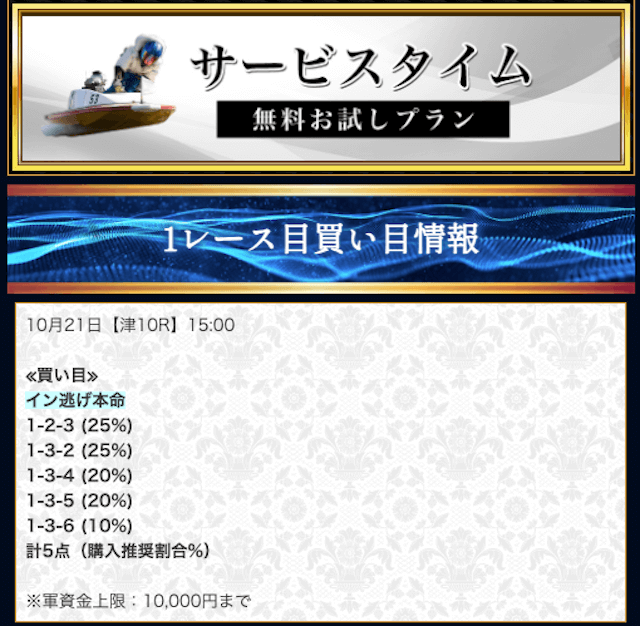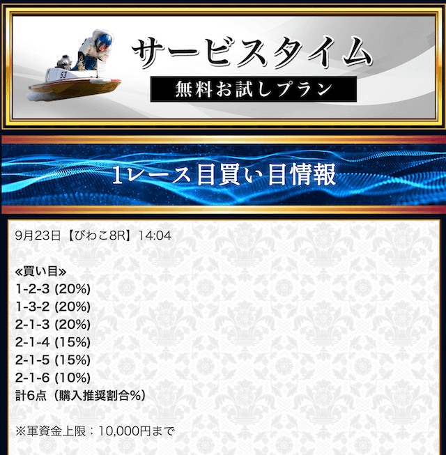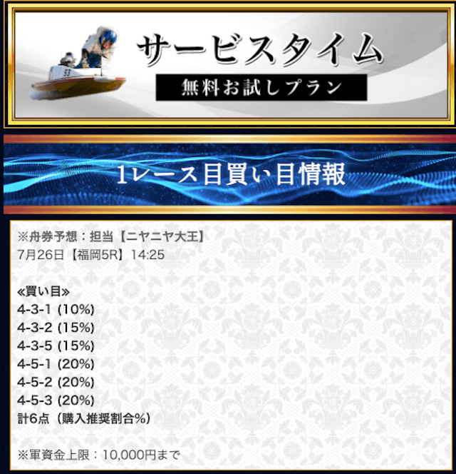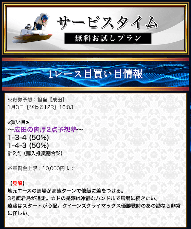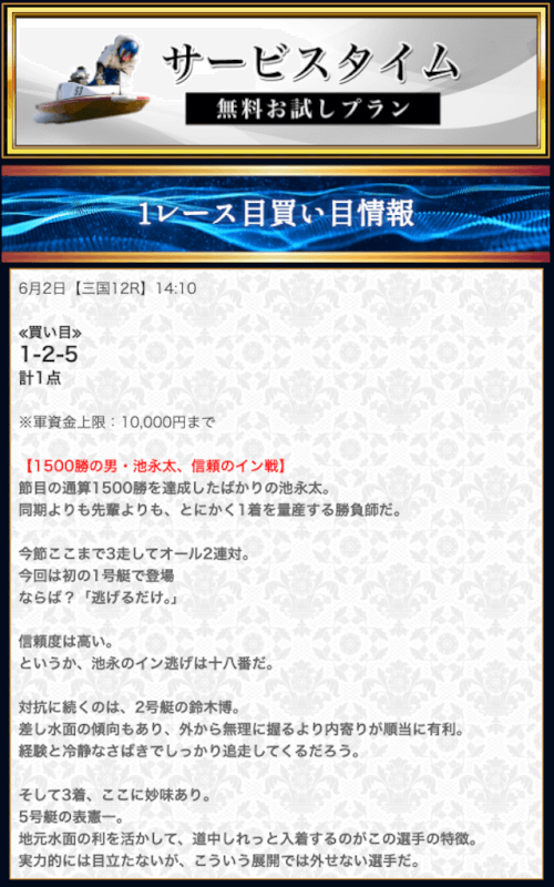 本来であれば無料予想の方へ先に参加するのですが、私は普段から競艇予想サイトで稼いでいて軍資金には余裕があるので、思い切って有料予想から敢えて実力を測ってみました。