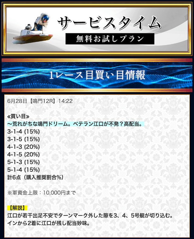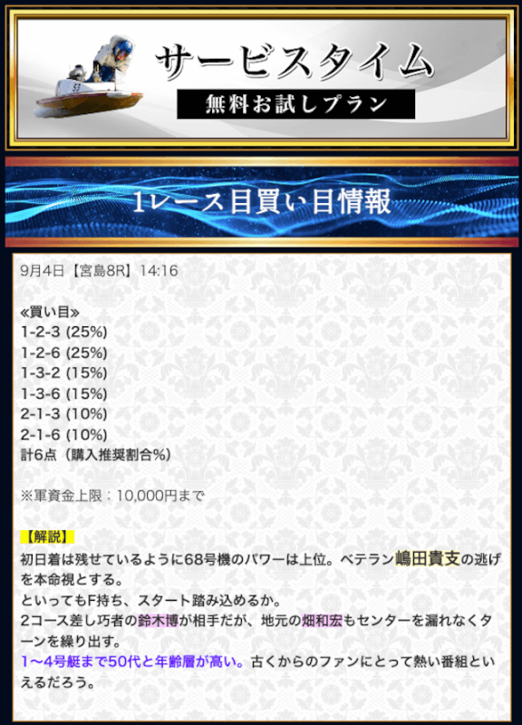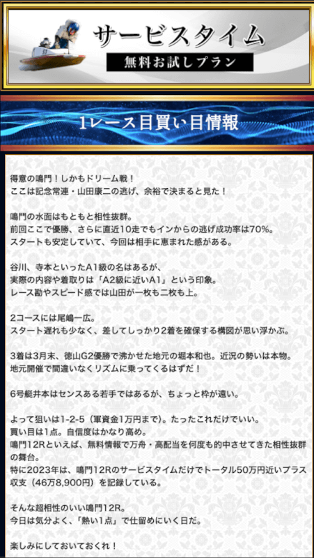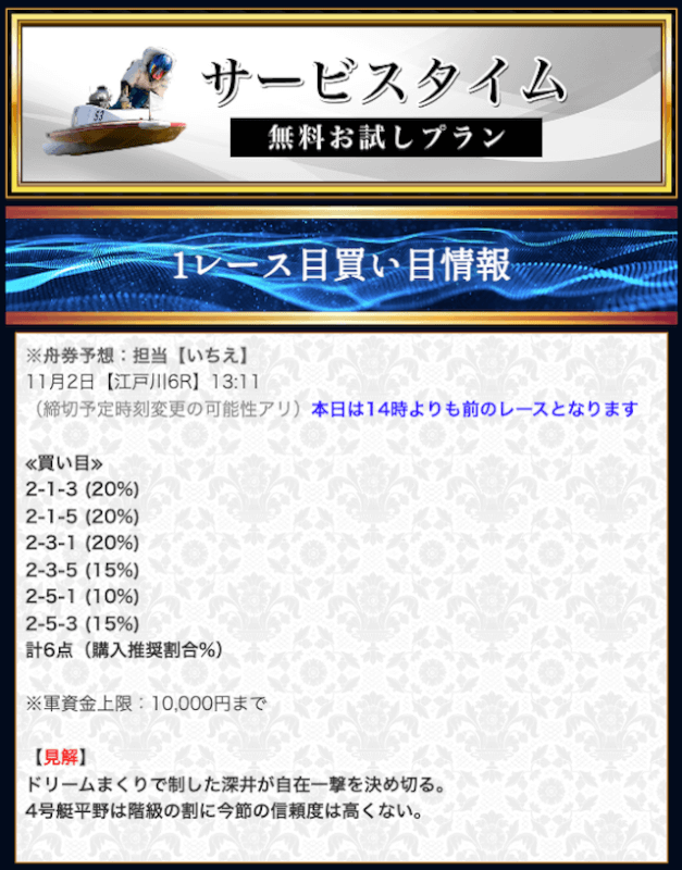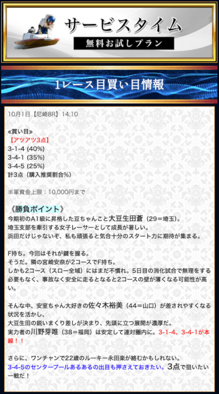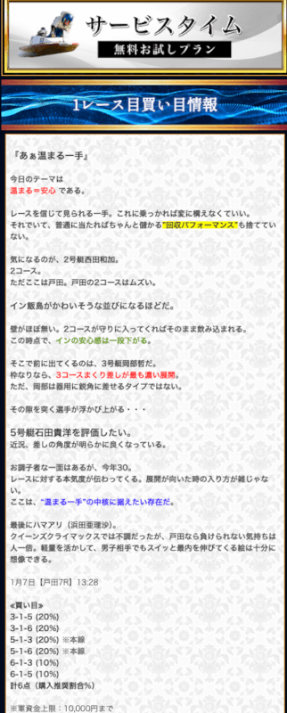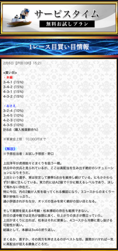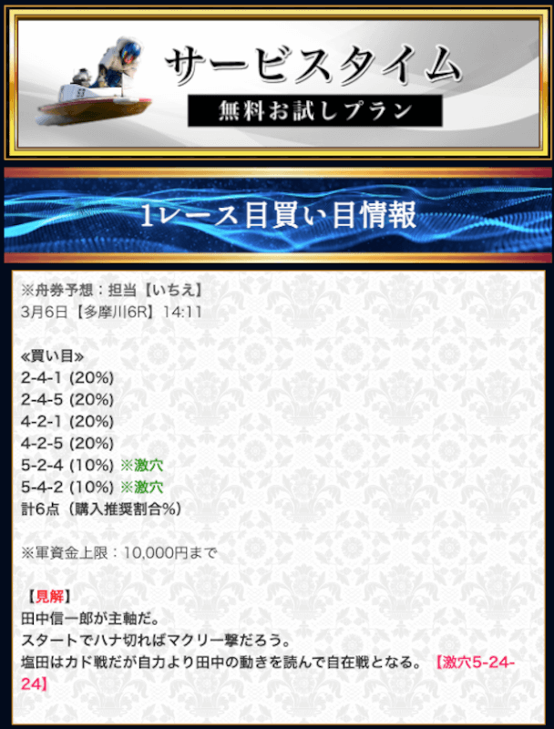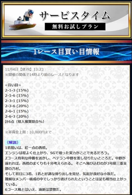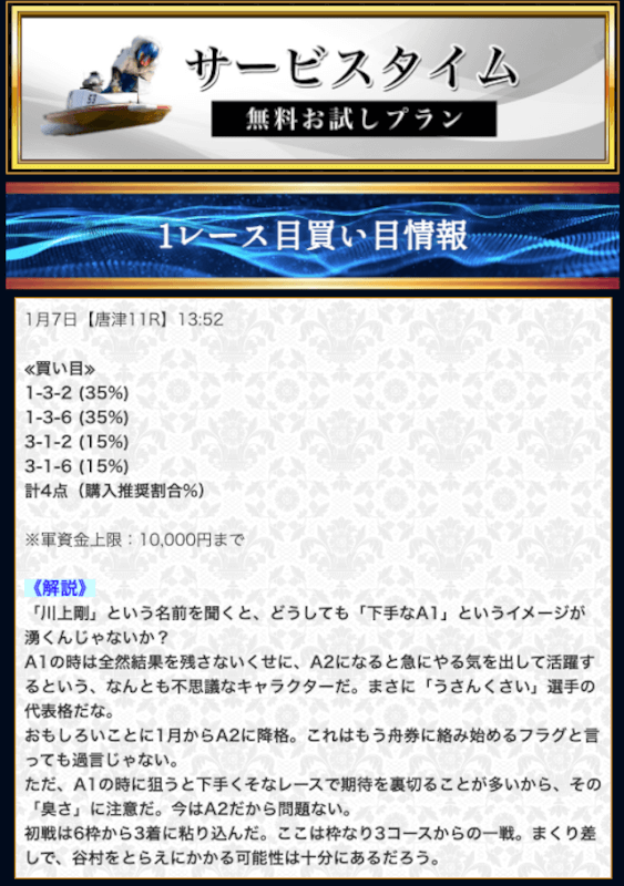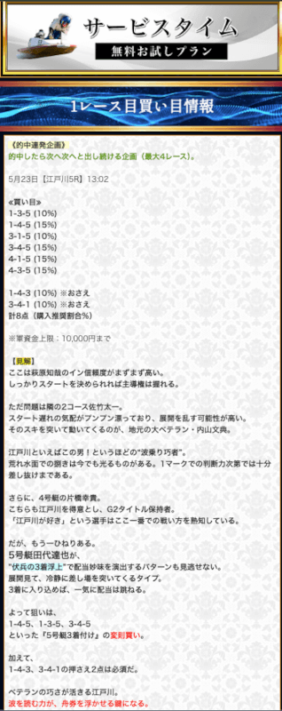 無料予想では堅実かつ穴も狙える貴重な予想が提供されます。無料予想で稼いだ後は有料予想にシフト。