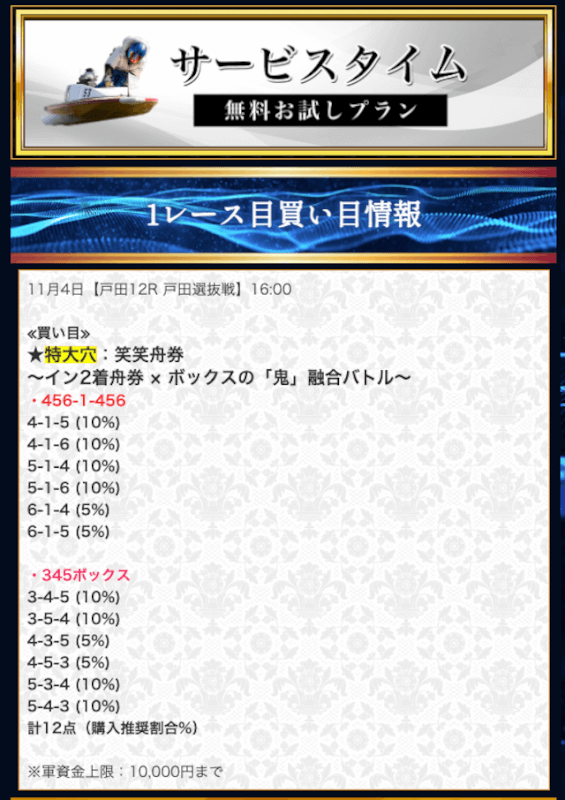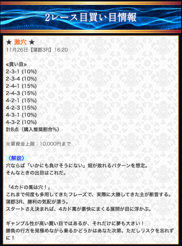 | プレジデント | 300,000円(3000PT) | デイ・ナイター | 三連単 | 3,500,000円 | 5点前後 | 2レースコロガシ | 破壊力満点 |
