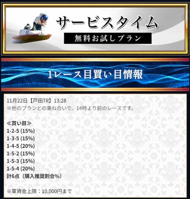 | 2025/11/22 | 戸田7R【】 | 3連単 | 11.8倍 | 23,600円 |