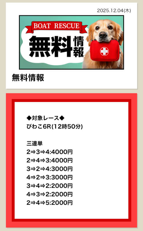 | 2025/12/04 | びわこ6R【️️️️️️】 | 3連単 | 35.9倍 | 108,900円 |