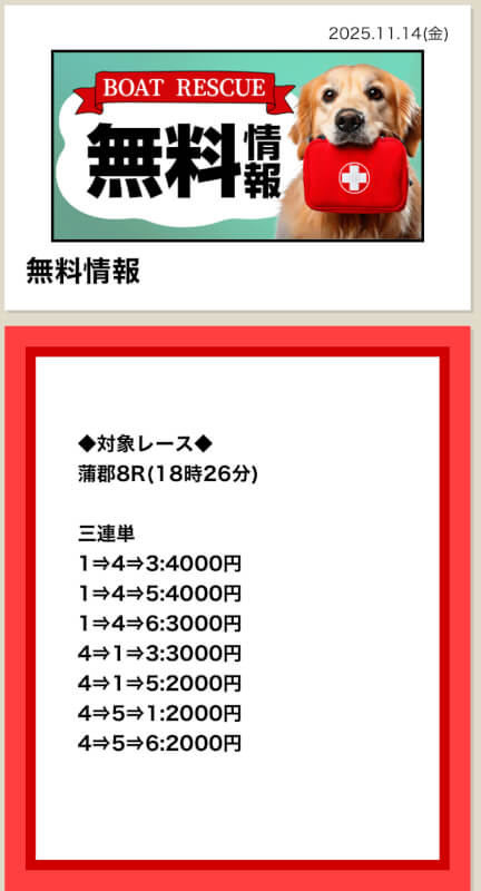 2戦勝負したけど、その1レースは万舟を当ててくれたよ!今まで自分では万舟を一度も当てることができなかったので、ボートレスキューの予想は凄すぎる。