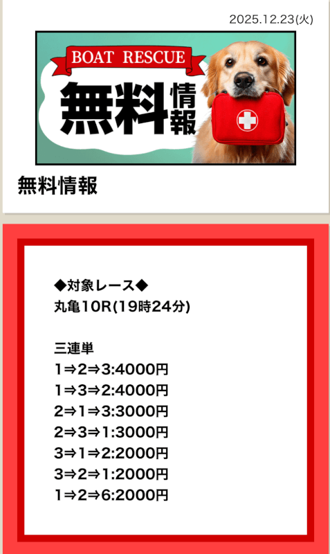 | 2025/12/23 | 丸亀10R【️️️️️️】 | 3連単 | 20.4倍 | 61,200円 |