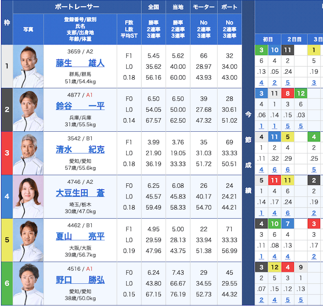 単純に実力だけ見れば頭の候補だが、特に⑥号艇野口は枠的に不利かつ直近の成績を見ても不調気味。