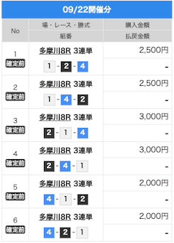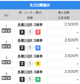 無料予想を含めて、ここまでの参加結果から見解予想は必要ないと思うので、買い目と購入金額からご覧いただこう。