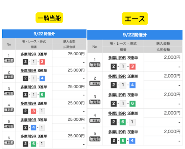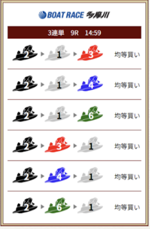 ②号艇を頭にした買い目はエースモーターズと一騎当船ともに同じ。