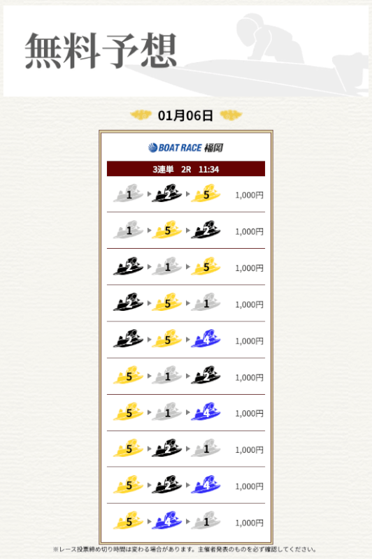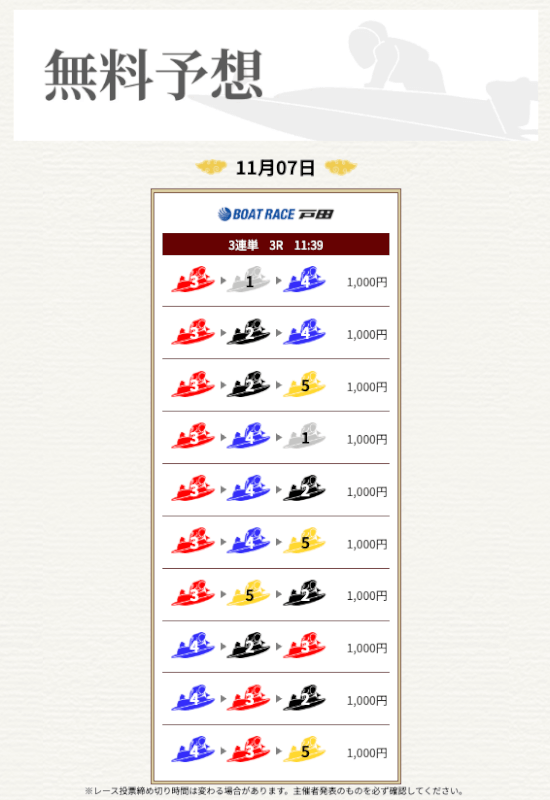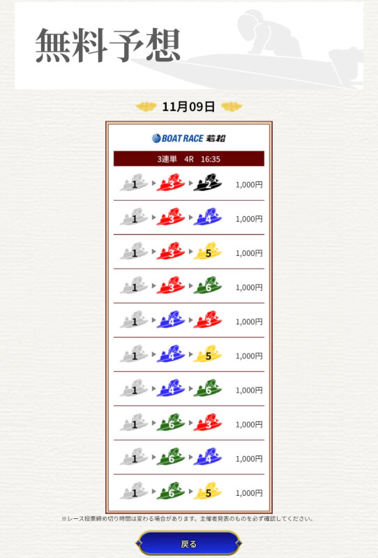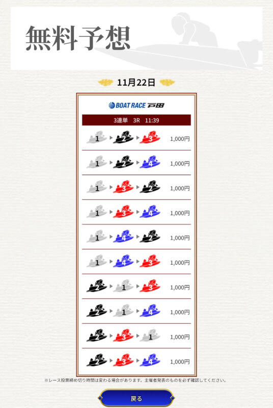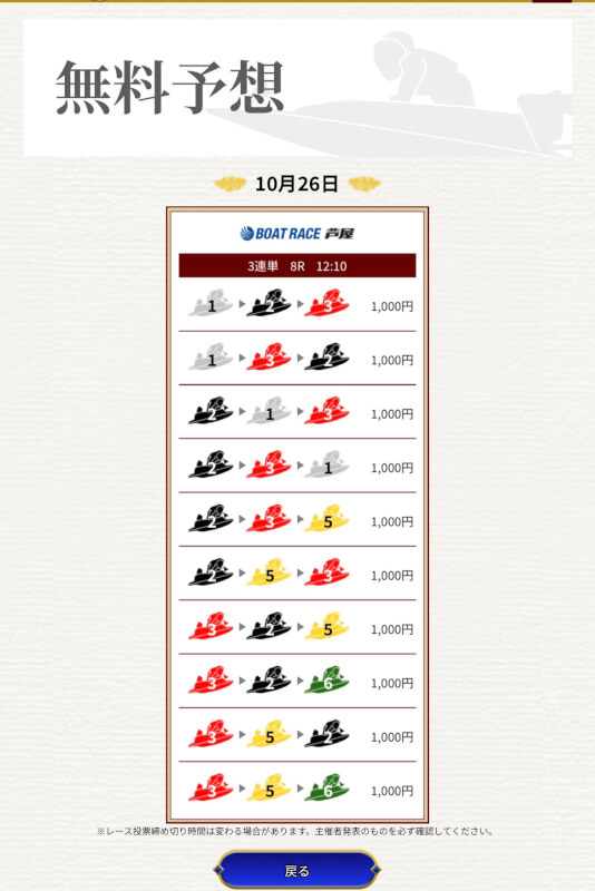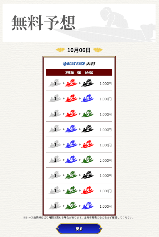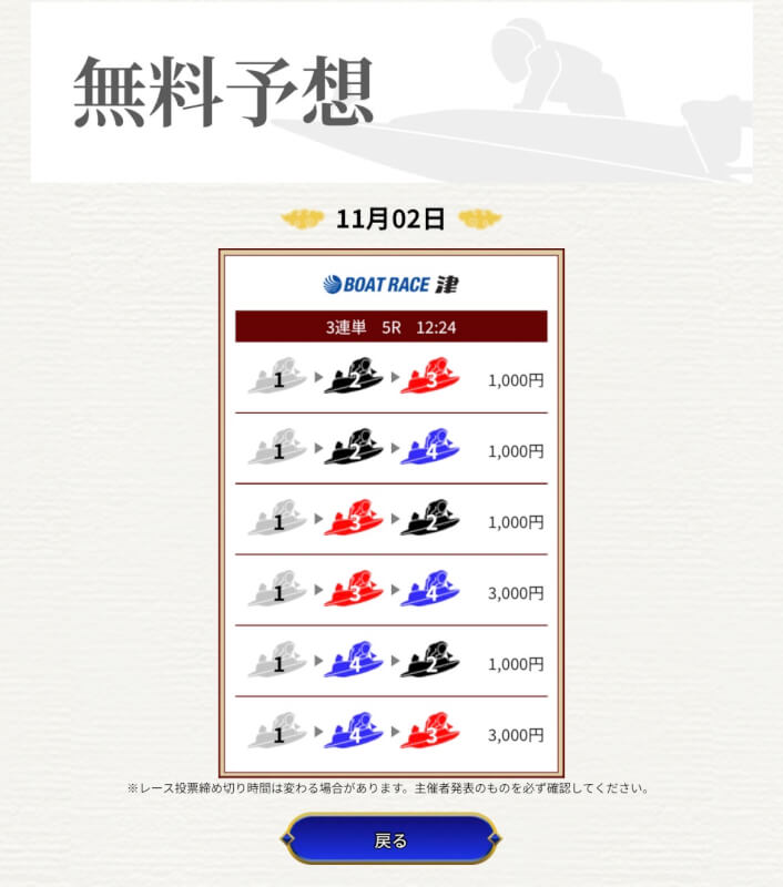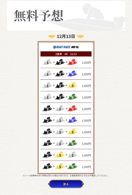 一騎当船の無料予想はまだ1戦だけなので、引き続き予想に参加していき精度を確かめていこうと思う。