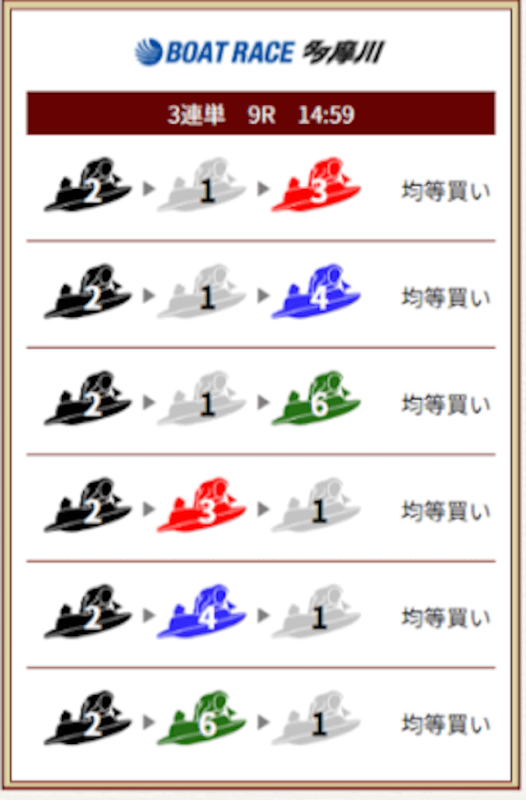 ②号艇を頭にした買い目はエースモーターズと一騎当船ともに同じ。