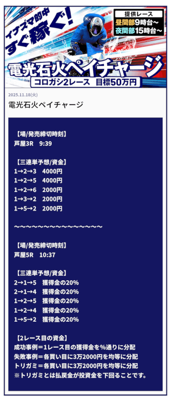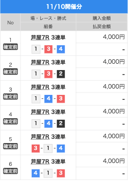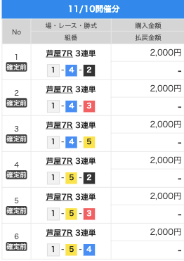 | 2025/11/12 | 芦屋10R【️️️️️️】 | 3連単 | 9.8倍 | 39,200円 |