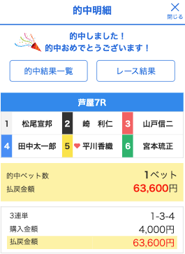 | 2025/11/10 | 芦屋7R【️️️️️️】 | 3連単 | 15.9倍 | 63,600円 |