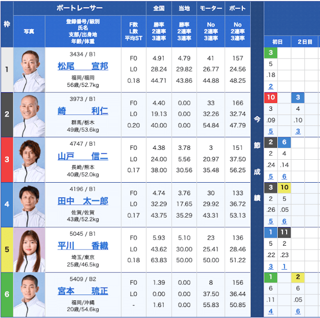 センターコース軸も悪くはないが、初日に6コースから2着入線を果たしている①松尾がやはりセオリーとも言える。