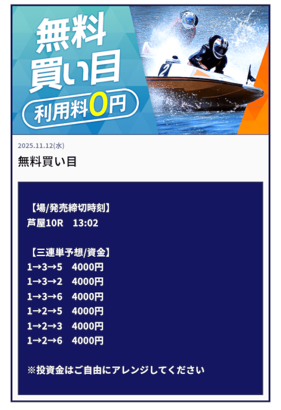 私がボートキングの無料予想に初参加したのは2025年11月10日の芦屋7R。