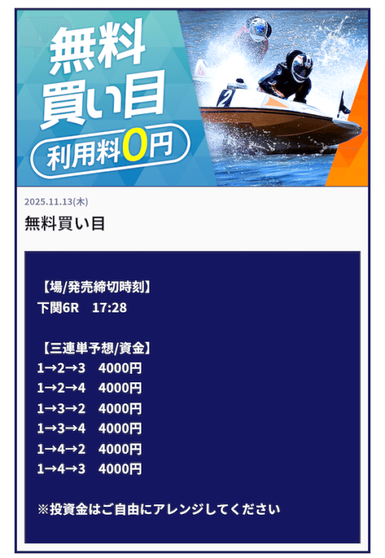 | 2025/11/13 | 下関6R【️️️️️️】 | 3連単 | 9.4倍 | 37,600円 |