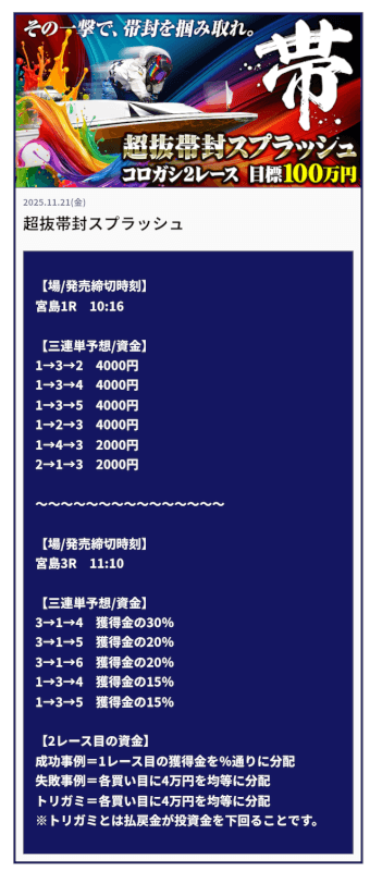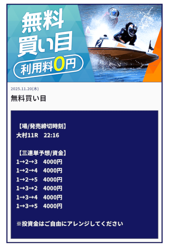| 2025/11/20 | 大村11R【️️️️️️】 | 3連単 | 14.5倍 | 58,000円 |