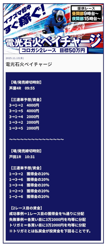 | 2025/11/16 | 江戸川6R【️️️️️️】 | 3連単 | 12.5倍 | 50,000円 |