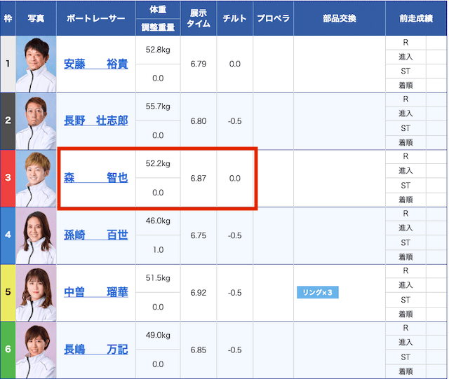 確かに3号艇森選手は直近での成績はイマイチであり、勝負どころと思っているのかもしれません。