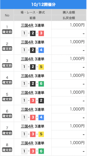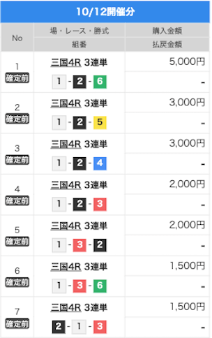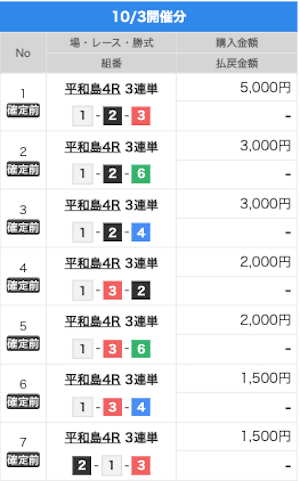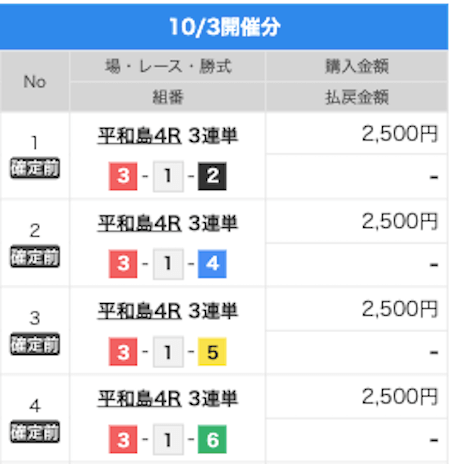 2025/10/06 | びわこ4R【️️️️️️】 | 3連単 | 10.5倍 | 52,500円 |