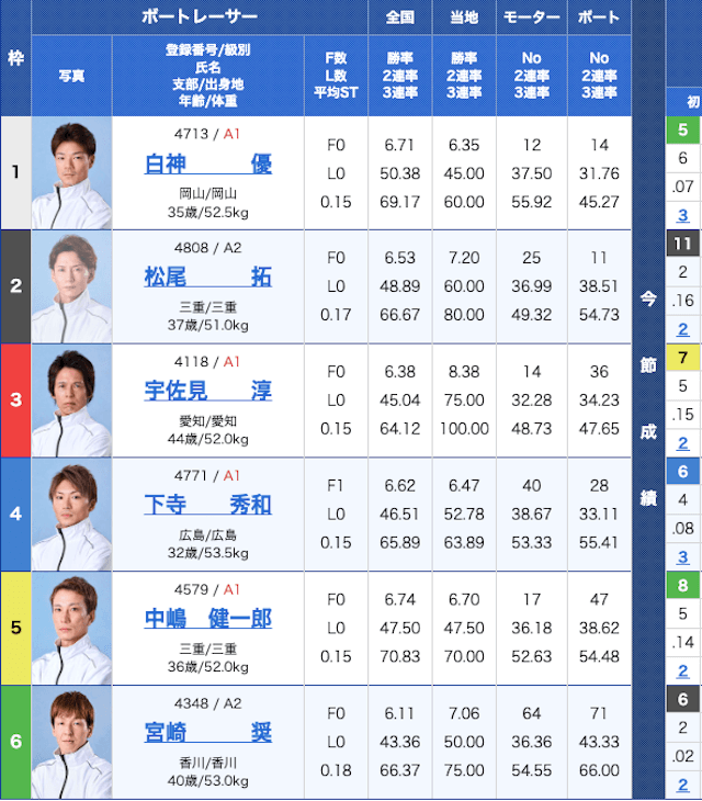 そこで今回の出走表を見てみると、1・3・4・5号艇にA1級選手が配置されている。