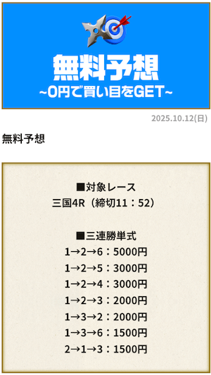 今回参加したのは2025年10月12日に提供された予想で、対象は三国競艇場の4R。