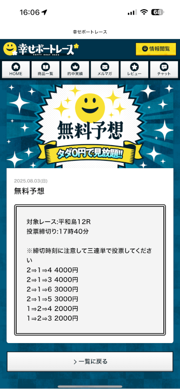 幸せボートレースの無料予想をまだ試したことが無い形は是非、今日の予想からでも試してみてほしい。