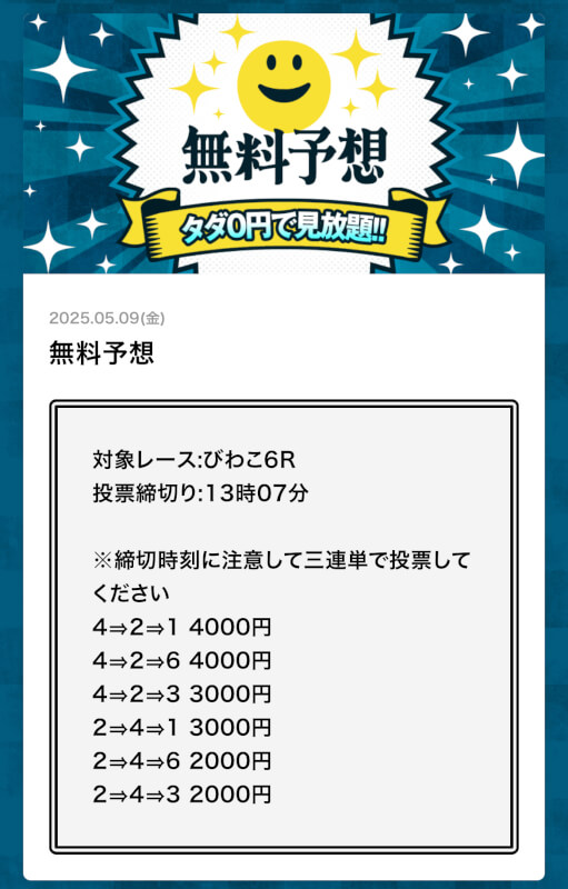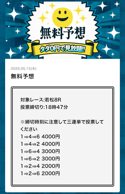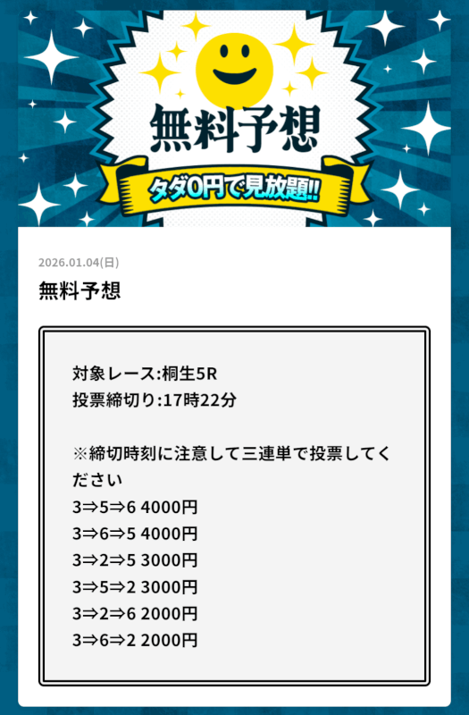 | 特徴① | 週に6日、1日2レース分の予想を無料公開 |