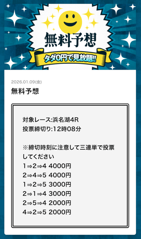 | 2026年1月9日 | 浜名湖4R【】 | 3連単 | 15.9倍 | 47,700円 |