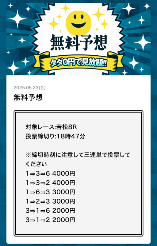 初回と2回目は無料予想で様子見して、3回目から有料プラン挑戦してます!