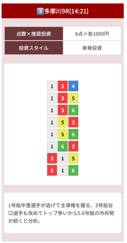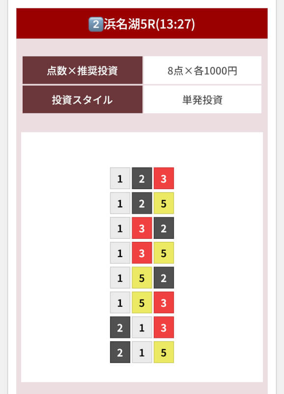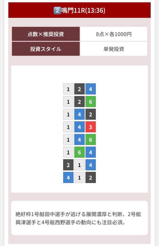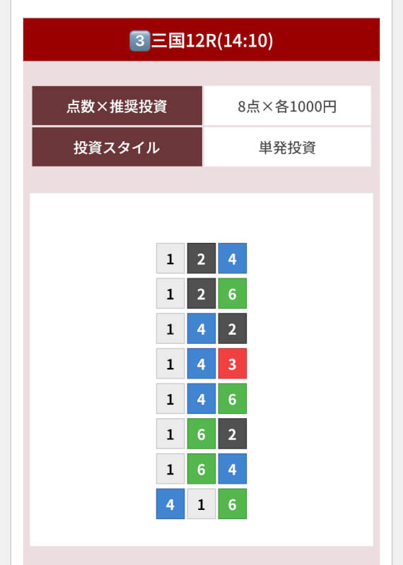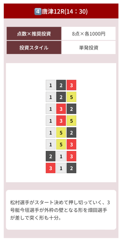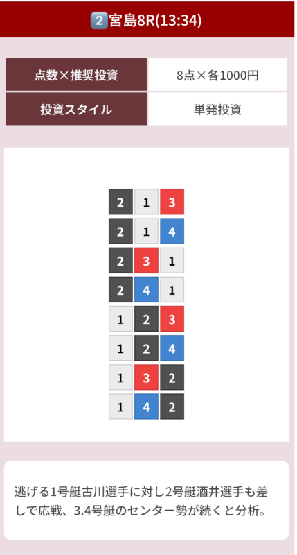 | 提供内容 | 3連単フォーメーション(計8点) |