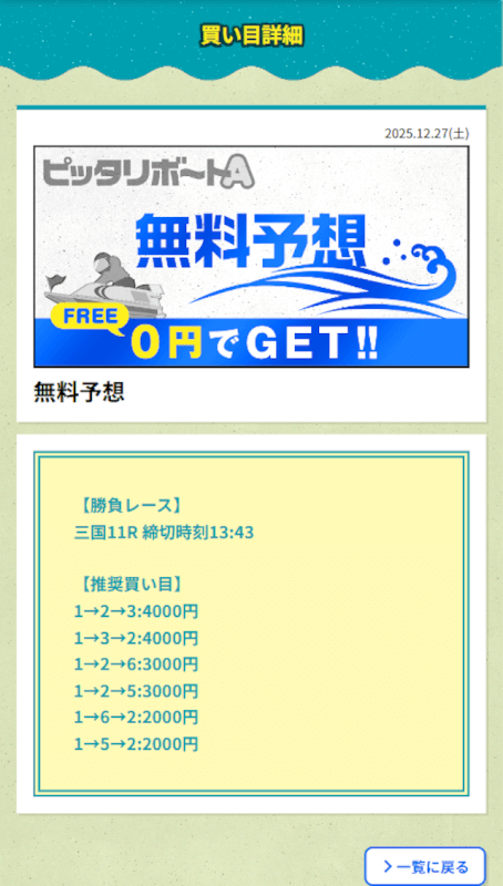 | 2025/12/27 | 三国11R【️️️️️️】 | 3連単 | 17.7倍 | 70,800円 |