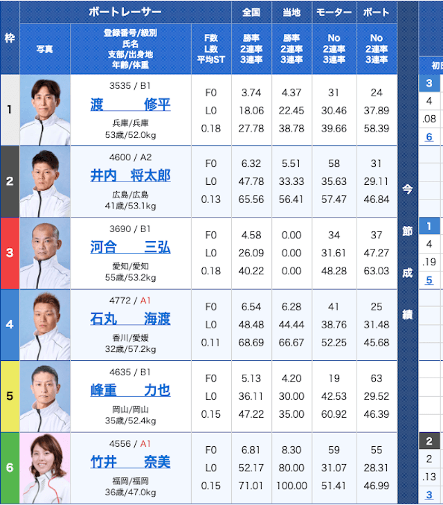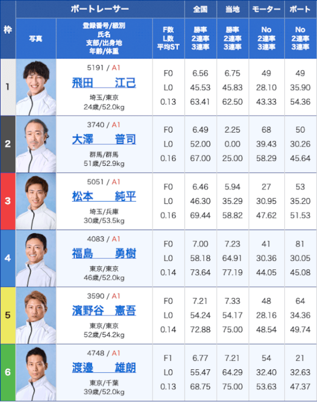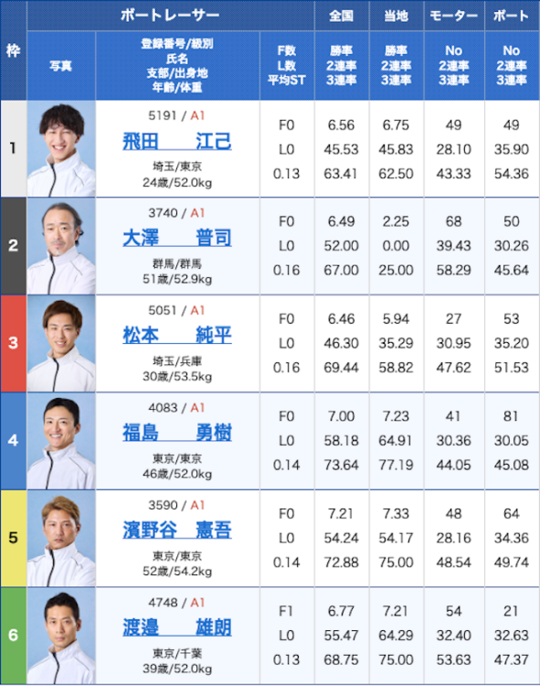 中でも①④⑤はこの多摩川競艇場は地元であるため、走り慣れている点は有利に働きそうだ。