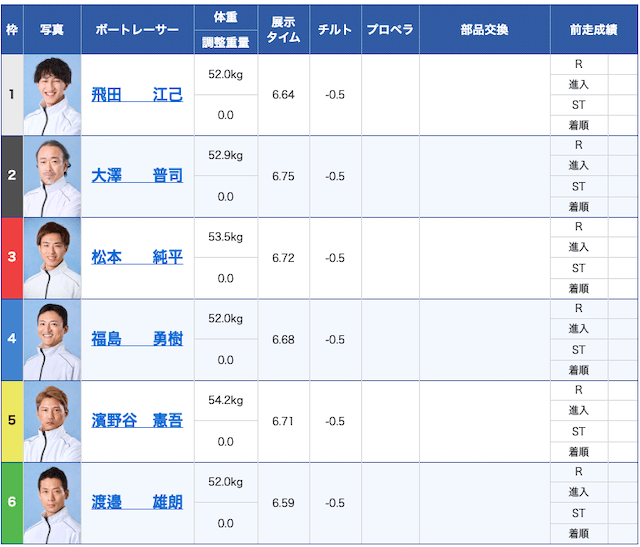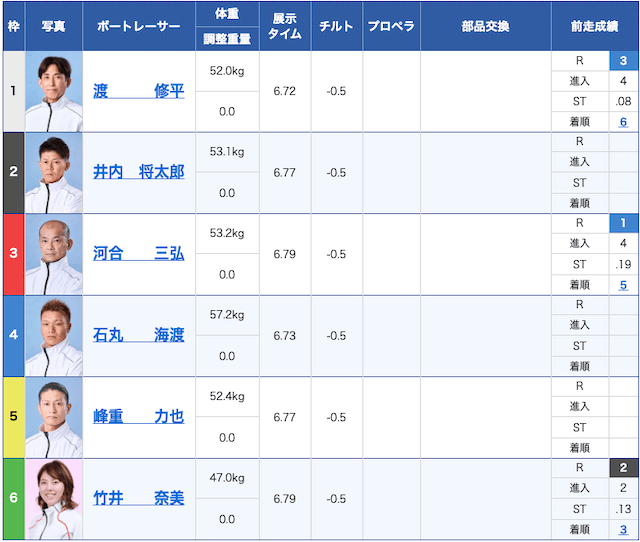 直前情報では、⑥渡邉の展示タイムが「6.59」でトップ。