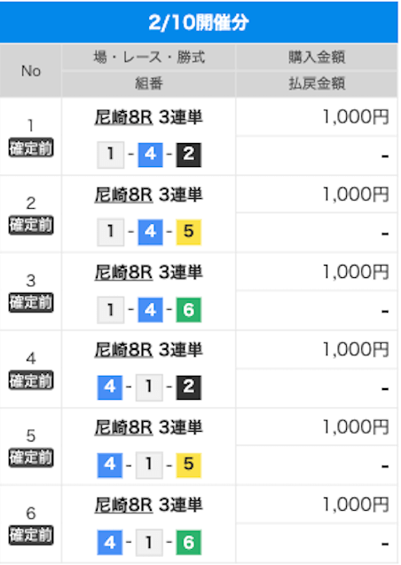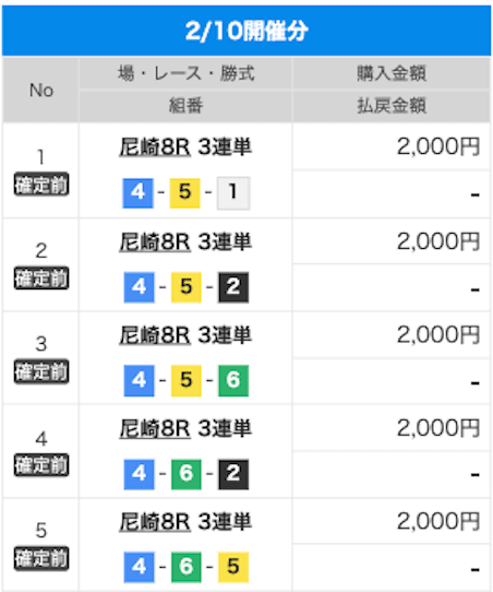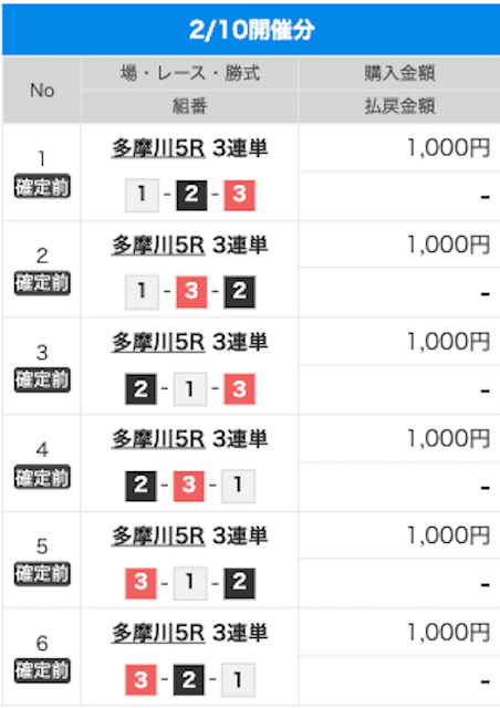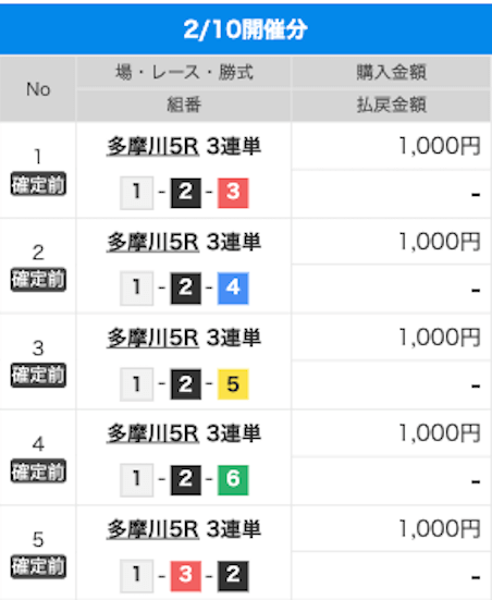 無料予想を含めて、ここまでの参加結果から見解予想は必要ないと思うので、買い目と購入金額からご覧いただこう。