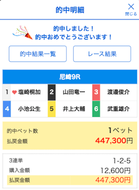 ここからプラン料金の25,000円と舟券代20,000円を差し引いても402,300円の利益!