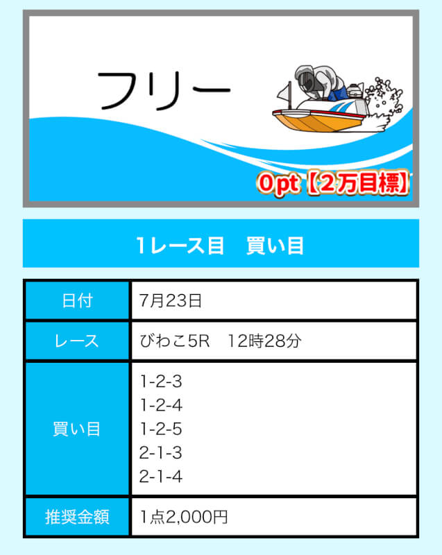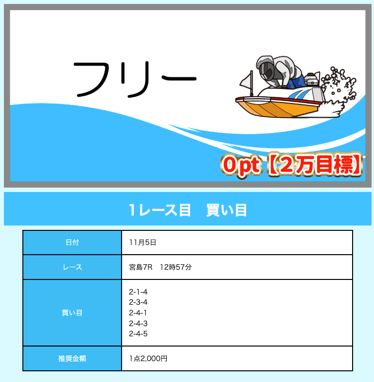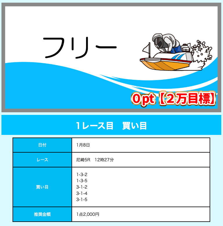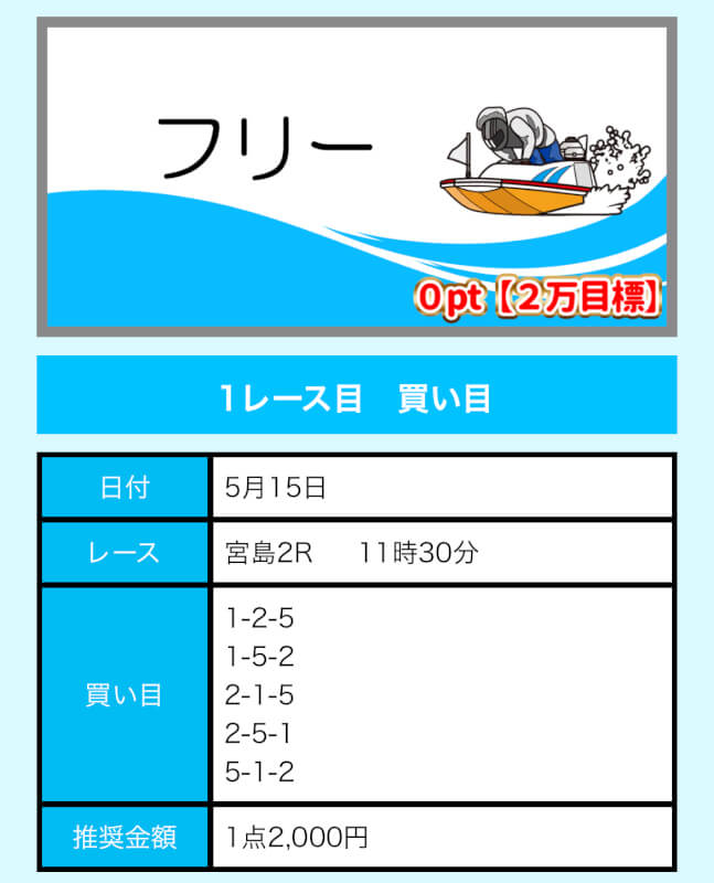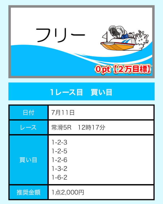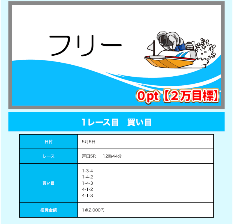 まあ当たらなくてもそれっぽい予想だったらしばらく続けてみようかなくらいの感覚で利用しましたが、無料予想でいきなり万舟的中させてくれました!
