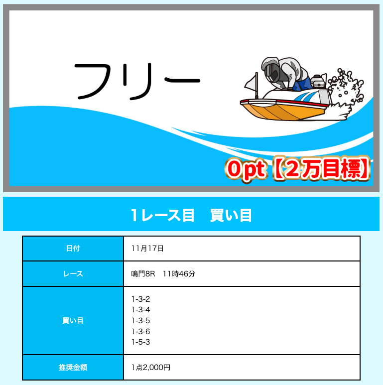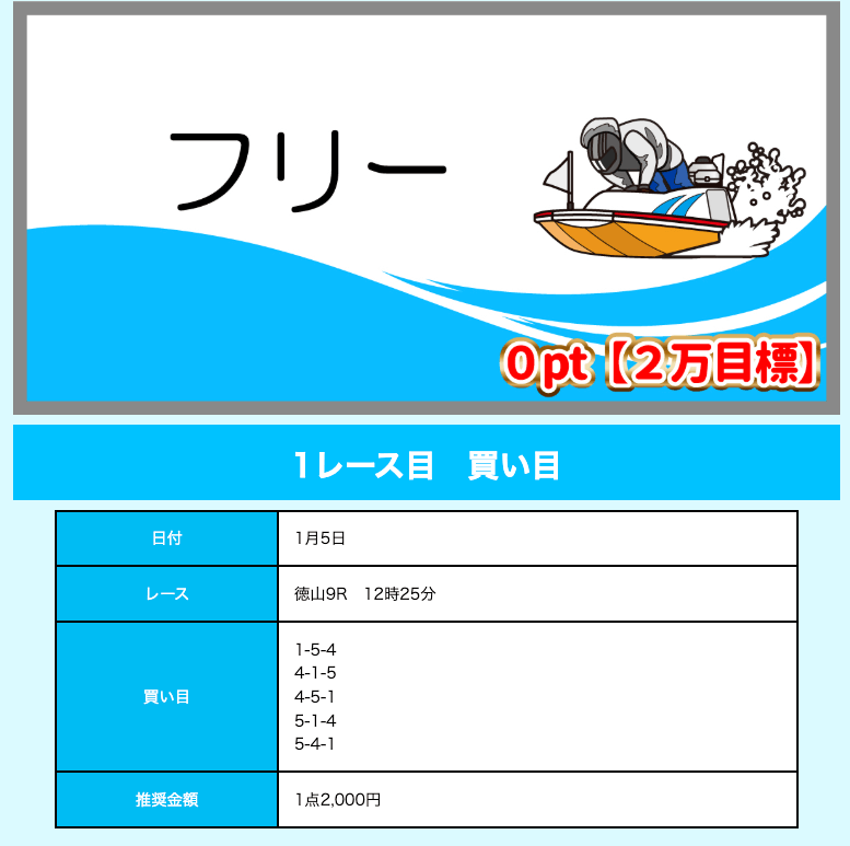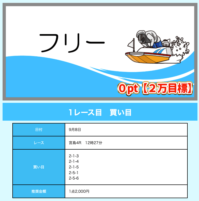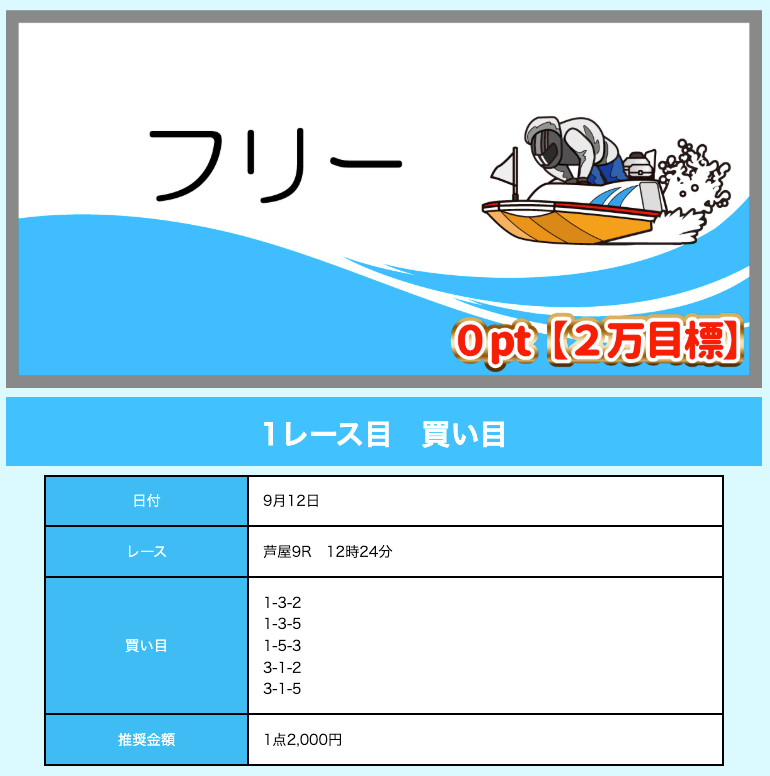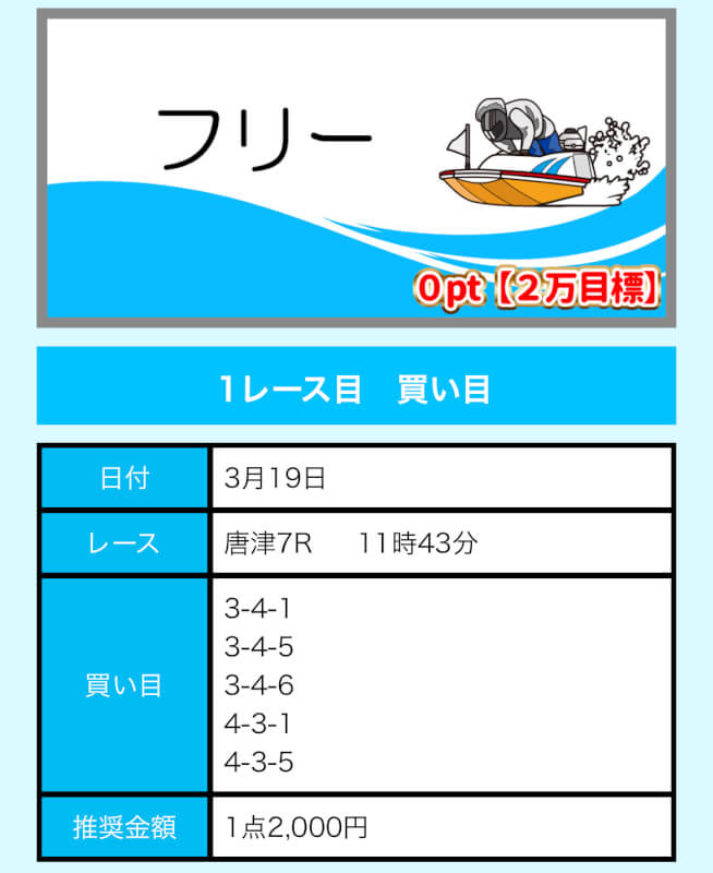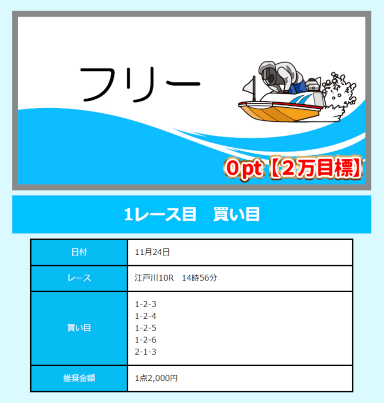 まあ当たらなくてもそれっぽい予想だったらしばらく続けてみようかなくらいの感覚で利用しましたが、無料予想でいきなり万舟的中させてくれました!