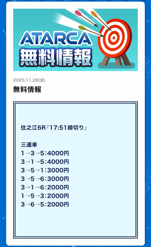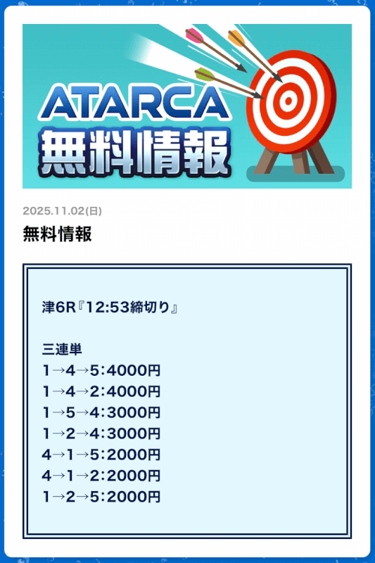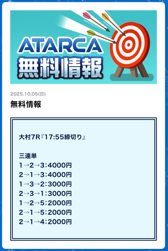 無料予想では結果を残してくれたATARCAですが、有料予想はどれだけの精度を持っているのか。