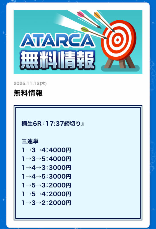 ATARCAは無料予想で申し分ない結果を残してくれたので現段階で『優良』と判断したい。
