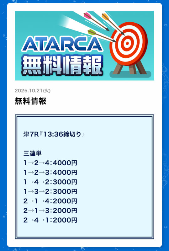 実際に提供された無料予想に参加してATARCAが利用に値するサイトなのかどうかを判断していく。