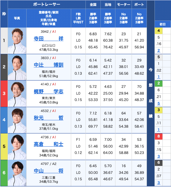 前半レースでも5コースから2着と舟券貢献をしているだけに軸からは外せないだろう。