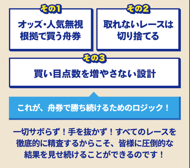 上記の3つを舟券で勝ち続ける為のロジックとしている。