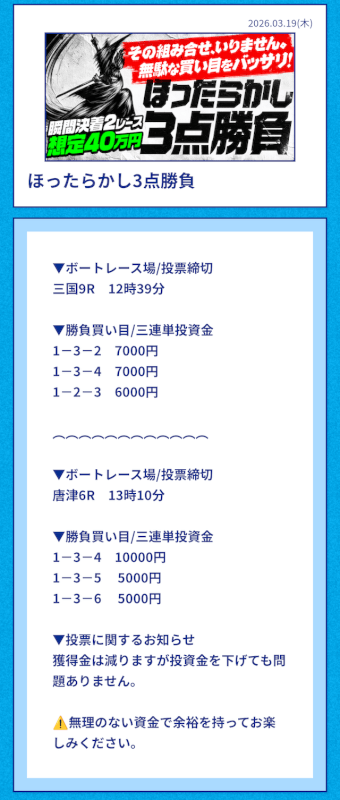 | 2026/03/19 | 唐津7R【️️️️️️】 | 3連単 | 15.8倍 | 79,000円 |