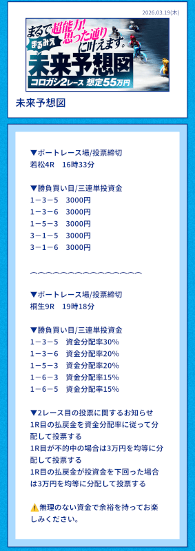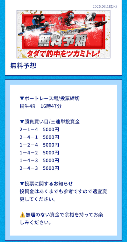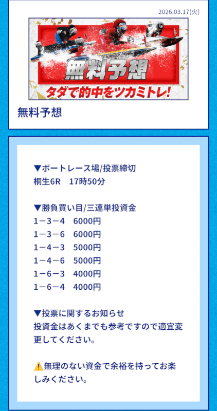 | 2026/03/17 | 桐生6R【️️️️️️】 | 3連単 | 8.4倍 | 50,400円 |