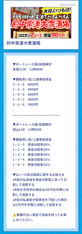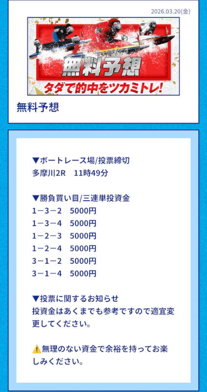 | 2026/03/20 | 多摩川2R【️️️️️️】 | 3連単 | 15.2倍 | 76,000円 |