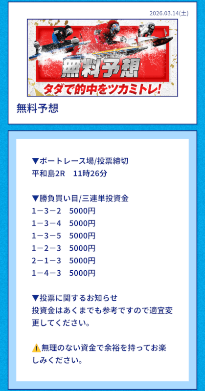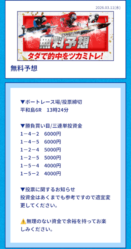 | 2026/03/11 | 平和島6R【️️️️️️】 | 3連単 | 22.9倍 | 91,600円 |