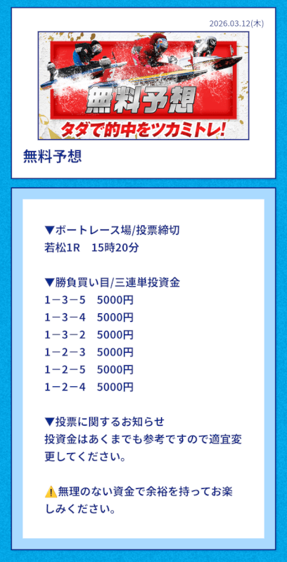 | 2026/03/12 | 若松1R【️️️️️️】 | 3連単 | 13.6倍 | 68,000円 |