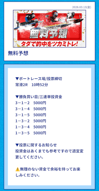 ある程度資金を持っている人や競艇予想中級者以上の人は推奨金額通りに勝負すると良いだろう。