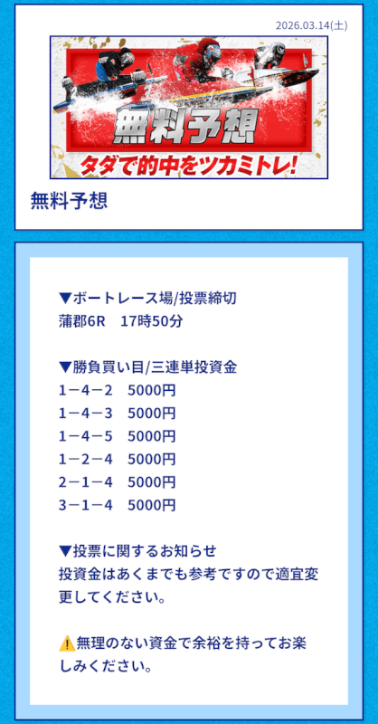 | 2026/03/14 | 蒲郡6R【️️️️️️】 | 3連単 | 15.8倍 | 79,000円 |