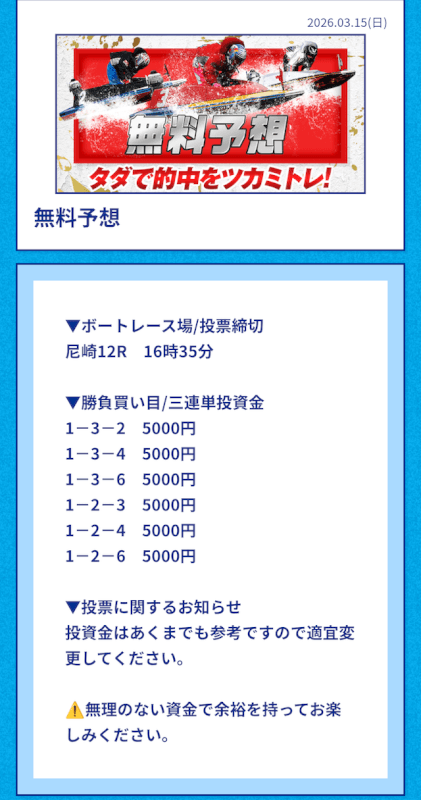 | 2026/03/15 | 尼崎12R【️️️️️️】 | 3連単 | 9.0倍 | 45,000円 |