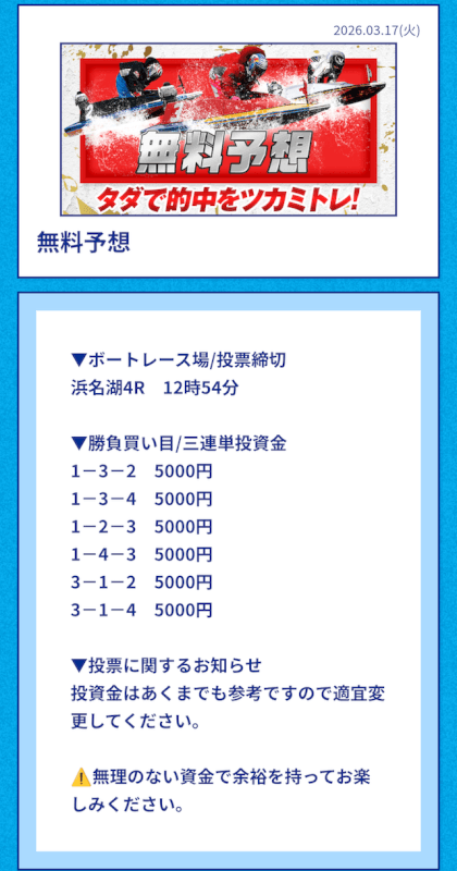 | 2026/03/17 | 浜名湖4R【️️️️️️】 | 3連単 | 13.2倍 | 66,000円 |