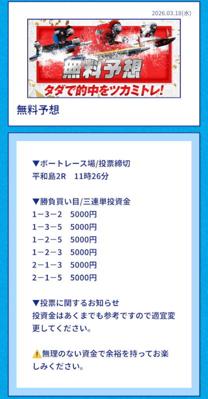 | 2026/03/18 | 平和島2R【️️️️️️】 | 3連単 | 11.8倍 | 59,000円 |